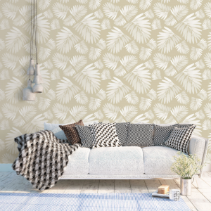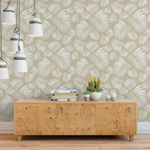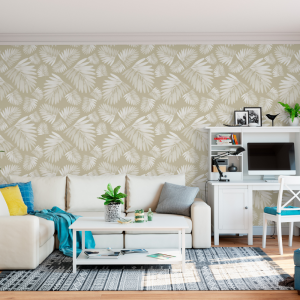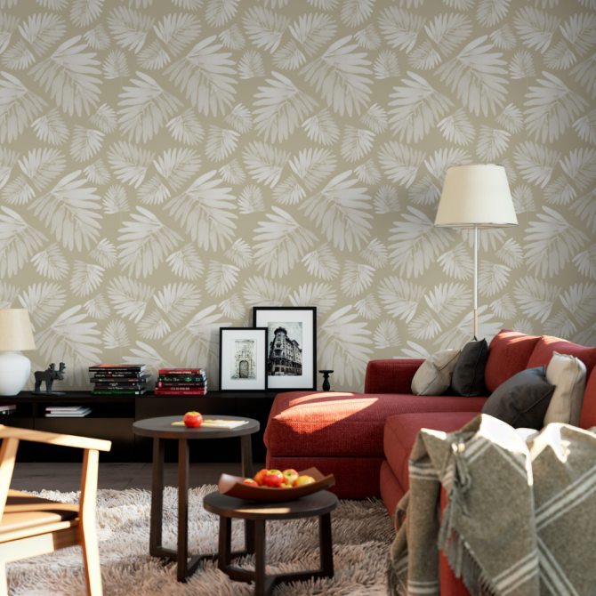 Kentia es un papel de pared decorativo con diseño tropical pintado a acuarela por lo que se aprecian delicadas sombras.